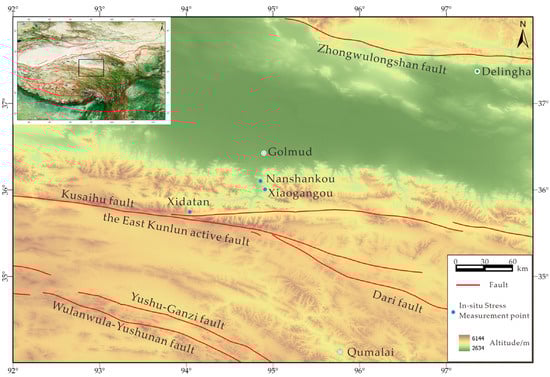 The East Kunlun fault zone represents a vast left-lateral strike–slip active fault located in the northern region of the Tibetan Plateau. It stretches for approximately 1600 km, spanning from the west of Whaili Lake on the border between Qinghai and Xinjiang to the east of Maqu [,,,]. In the western portion of the East Kunlun active fault, the Kusai Lake fault and the Xidatan fault constitute a miter complex []. The Quaternary activity of these two faults is intense and is closely correlated with potent and large earthquakes. The research findings suggest that the Kusai Lake fault and the Xidatan fault can rupture independently and simultaneously, resulting in moderate and strong earthquakes. The magnitude 8.1 earthquake occurred on the Kusai Lake fault on 14 November 2001 [,,]. This indicates that the Kusai Lake fault possesses the activity pattern of large earthquakes of magnitude 8 or above. The displacement of the fault landform of the Xidatan fault also implies that the magnitude of the ancient earthquake is approximately 8, reflecting that these two sections have the capacity for recurrent strong earthquakes. Since approximately 20 ka BP, nearly all the paleoearthquakes of the Xidatan fault have occurred 70–500 years after the paleoearthquakes of the Kusai Lake fault. After the magnitude 8.1 earthquake in 2001, the Xidatan fault has an elevated risk of strong earthquakes of approximately magnitude 8 within the next 70–100 years and constitutes a potential epicenter area for strong earthquakes in the northern Tibetan Plateau. The history of paleoseismicity in the East Kunlun fault zone holds significant importance for understanding the fracture characteristics and recurrence regularity of strong earthquakes []. Liao, C.T. et al. [] compared and observed the alterations in in situ stress before and after the M8.1 earthquake in the East Kunlun Mountain Pass and discovered that approximately two-thirds of the in situ stress was released after the Ms 8.1 earthquake (from May to July 2003). Nevertheless, the piezomagnetic stress relief method was utilized then, and the test depth was relatively shallow. Hence, more and deeper in situ stress data regions are required to study the current stress field characteristics in this area. From the perspective of in situ stress measurement, this paper analyzes the characteristics of in situ stress accumulation and seismic risk in the region, utilizing the stress states of four deep boreholes measured by the author and one borehole measured by previous researchers.