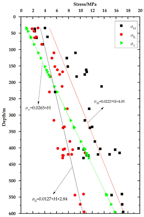 As illustrated in Figure 3, the state of in situ stress varies with increasing depth. In the interval from the surface to 206.00 m, the in situ stress condition is characterized by σH > σh > σv, indicative of a reverse faulting regime. Below a depth of 206 m, however, the in situ stress state transitions to σH > σv > σh, which corresponds to a strike–slip faulting regime.