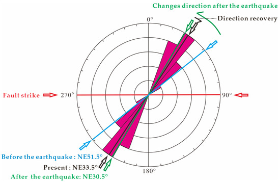 Before and after the earthquake, the direction of in situ stress changes, gradually adjusting to align with the pre-earthquake in situ stress orientation. Previous studies indicate that the average direction of maximum principal stress in this region was NE51.5° prior to the earthquake, shifting to 30.5° post event [,]. Figure 4 illustrates the directional characteristics of maximum horizontal principal stress in this area, derived from in situ stress tests conducted using hydraulic fracturing methods across five boreholes. The results predominantly fall within the range of NE20°–NE54°, with an average value of NE33°. When compared to earlier research findings, it is evident that the current direction of maximum horizontal principal stress closely resembles that observed after the earthquake. This suggests that while there is ongoing recovery within the current stress field, it has not yet returned to its pre-earthquake levels.