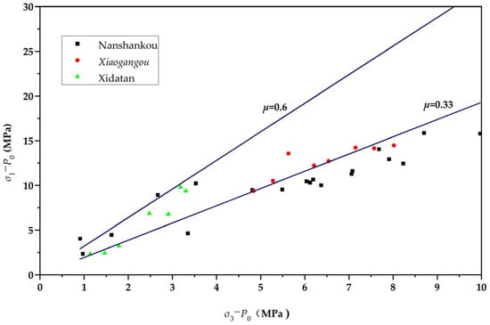 Based on actual measurements and linear regression analysis, it has been determined that, in the study area, σH > σh > σv within a depth range from the surface to 206 m corresponds to a reverse fault in situ stress state; conversely, below 206 m, σH > σv > σh characterizes a strike–slip fault in situ stress state. Therefore, Equation (3) is employed in this study to analyze fault stability. For reverse faults, when the ground stress state is at depths greater than 206 m, σ1 = σH and σ3 = σv; for depths less than 206 m, the ground stress state corresponds to that of a strike–slip fault, with σ1 = σH and σ3 = σh. The values of σ3 at various depths were utilized to compute σ1 at friction coefficients of μ = 0.6 and μ = 1.0. Figure 5 presents the analysis results of the ground stress states in the study area. From Figure 5, it is evident that the maximum horizontal principal stress in several test sections exceeds the lower threshold of the fault slip critical value, whereas the remaining sections remain below this threshold. Therefore, the likelihood of fault slip in this region is minimal. The better linearity and lower μm values at the Xidatan may be related to the closer proximity to the fault and more complete stress release after the earthquake.