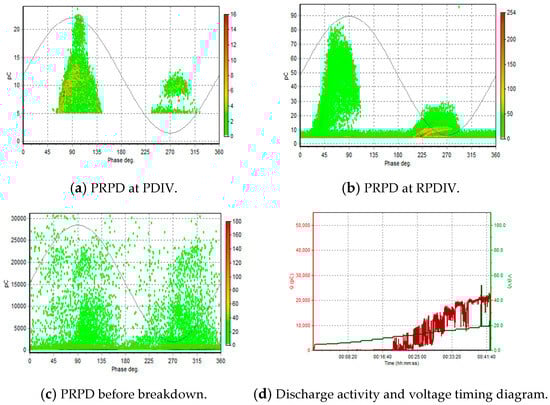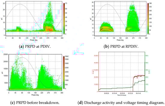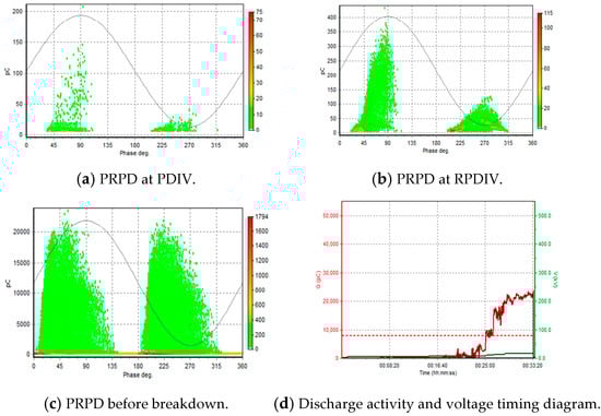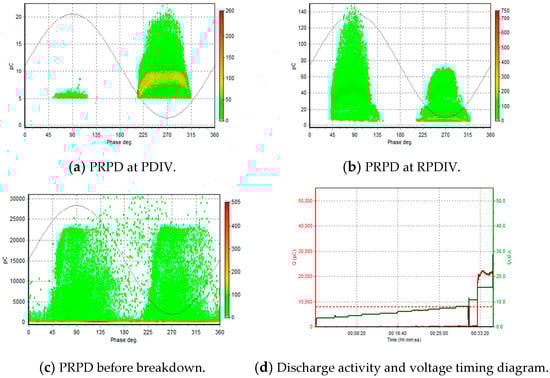 Figure 7 shows the recorded PRPD patterns of a representative sample (one of the eight tested samples) during the TE sample breakdown test. The PDIV was measured at 5.5 kV, as shown in