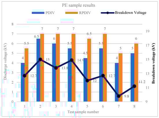 Figure 6 shows the statistical results of the breakdown tests conducted on eight PE samples. The average PDIV was 5.13 kV, whereas the average RPDIV was 6.38 kV. The overall average breakdown voltage of the samples was 12.8 kV.