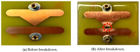 27] on PCB breakdown under rectangular pulse injection have suggested that dielectric failure typically occurs as a solid–gas composite breakdown. The key factors influencing this include trace spacing, pulse width, and pulse-repetition frequency (PRF). A larger spacing and wider pulses tend to increase the breakdown voltage, whereas a higher PRF and longer pulse durations generally lower it. These findings are important for improving the electromagnetic compatibility and the insulation strength of high-voltage applications. However, there are limited data on PCB behavior under AC sinusoidal conditions, which more closely simulates real-world operational stresses. This study aims to analyze PDIV and breakdown behavior under different electrode geometries using sinusoidal AC stress, which more accurately reflects the challenges faced by PCBs in real-world applications.