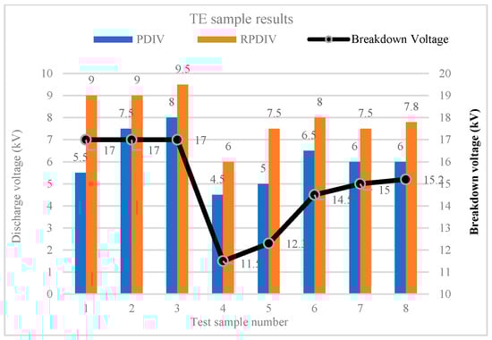 Figure 9 shows the statistical results compiled from the eight TE samples that completed the breakdown tests. The average PDIV value was 6.13 kV, the average RPDIV was 8.04 kV, and the average breakdown voltage of the samples was 14.9 kV.