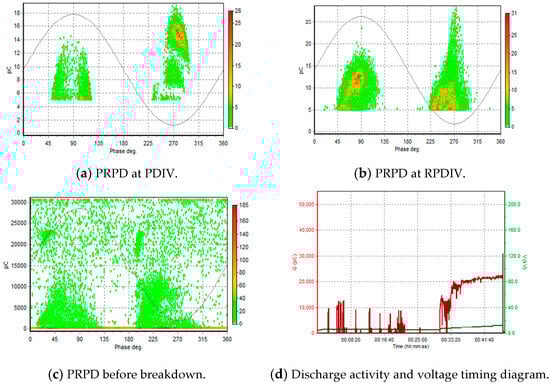 Figure 4c depicts the last PRPD pattern recorded before breakdown, which occurred at 12.7 kV. The maximum discharge was approximately 25 nC. The corresponding discharge activity and voltage timing diagram is shown in