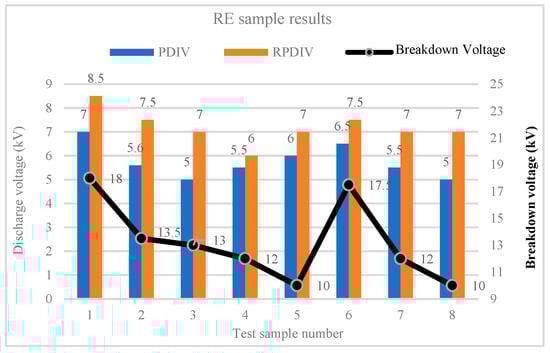 Figure 12 shows the statistical results of the eight RE samples that completed the breakdown tests. The average PDIV was 5.76 kV, the average RPDIV was 7.19 kV, and the average breakdown voltage for the samples was 13.3 kV.