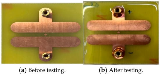 Figure 14 shows the images of the FE_0.5 mm sample before and after the testing, which ultimately did not experience breakdown during the test. None of the eight samples experienced breakdown; instead, a whitening effect was observed near the proximity of the two electrodes.
