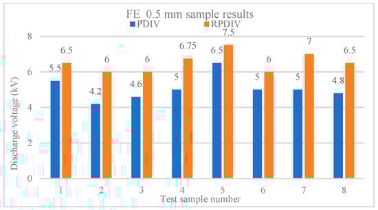 Figure 15 shows the statistical results of the breakdown tests conducted on the eight FE_0.5 mm samples. The average PDIV was 5.08 kV and the average RPDIV was 6.53 kV. As none of the samples experienced internal breakdown, the results did not include the breakdown voltage or average breakdown voltage, as shown in