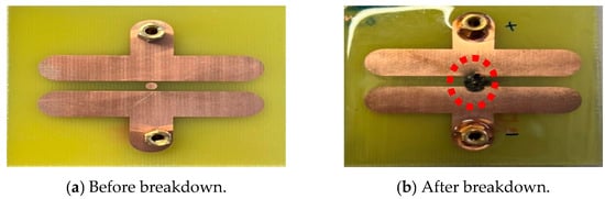 Figure 17 shows the images of the FE_0.3 mm sample before and after final breakdown, with the red circle marking the breakdown location. Breakdown occurred in the region closest to the intersection of the two electrodes and at the central point, where the carbonized area confirmed the electrical conduction between the positive and negative terminals.