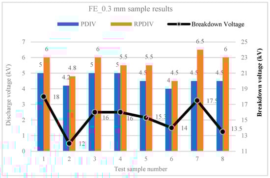 Figure 18 shows the statistical results of the breakdown tests on the eight FE_0.3 mm samples. The average PDIV was 4.59 kV and the average RPDIV was 5.6 kV. The overall average breakdown voltage of the samples was 15.3 kV.