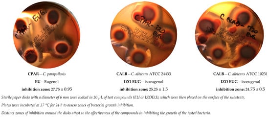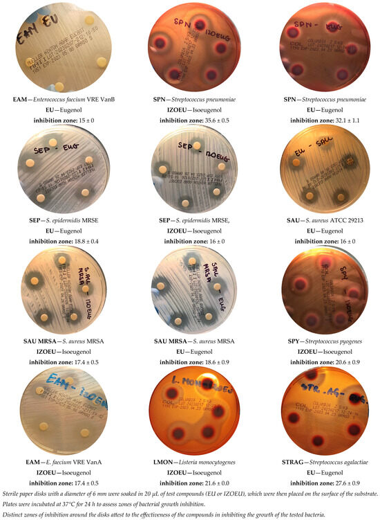 The present study evaluated the antimicrobial activity of eugenol and isoeugenol, components of essential oils that are known for their valuable biological properties. In order to test their efficacy against the selected microorganisms, they were tested on eleven strains of Gram-positive bacteria. The results of the performed tests, along with the detailed summary of the antimicrobial activity of the two compounds, are presented in Table 2 and illustrated from selected images (Figure 2).