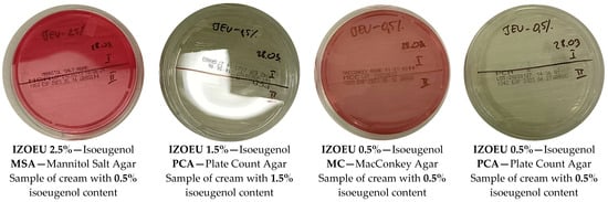 The creams containing eugenol at the concentrations of 0.5%, 1.5%, and 2.5%, and isoeugenol at the same concentrations, were tested on PCA, MC, MSA, BHI broth, and D/E neutralizing broth. No growth of bacteria or yeast-like fungi was observed in any of the cases. These results suggest that eugenol and isoeugenol can effectively reduce the growth and/or eliminate microorganisms from the cream samples, which is important for maintaining the hygiene and safety of cosmeceutical products.