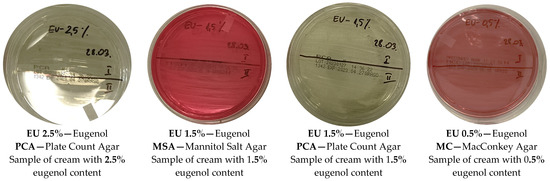 In the second phase, the liquid media were transferred to the solid media using the same sterile calibrated loop to assess the proliferation of minimal quantities of bacteria and fungi. After transferring the broths onto the solid media, the plates were again incubated at 37 °C for 24 h. Subsequently, the colonies that emerged were examined. As a control, a cream base without any added compounds was inoculated [10,12]. Throughout the duration of the experiment, the creams were stored at 4 °C. The entire experiment was conducted in triplicate to ensure the reliability of the results [14,16].