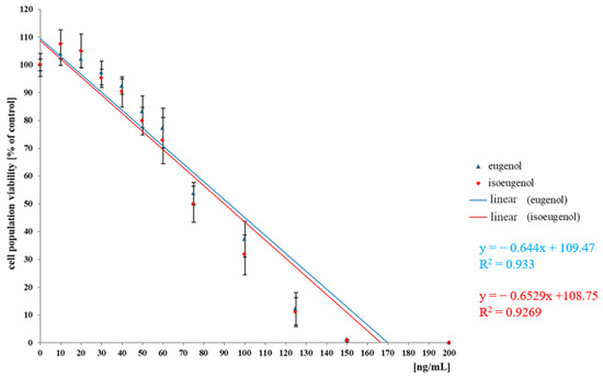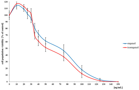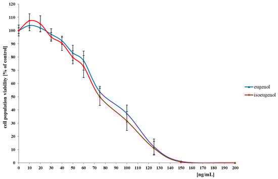 The results show the anticancer properties of eugenol and isoeugenol on the LoVo cell line, measured as the percentage of cell survival and at concentrations in the range of 10–200 ng/mL with respect to the control system, where a value of 100% viable cells was assumed (Figure 6).