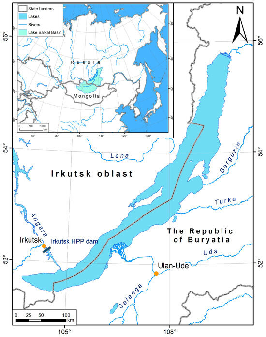 Lake Baikal is located in the Asian part of Russia, within the Irkutsk Oblast (the western part of the lake) and the Republic of Buryatia (the eastern part of the lake). The total area of the lake is 31,722 km2 and its length is 636 km [28]. The length of the shoreline reaches more than 2000 km [28]. It is the deepest lake on the planet and also the largest in terms of freshwater volume (Figure 1).