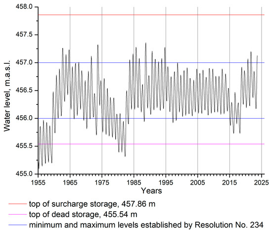 In order to prevent similar situations, on 26 March 2001, the Government of the Russian Federation issued Resolution No. 234 “On Limit Values of Lake Baikal Water Level in the Course of Economic and Other Activities”, which established minimum and maximum levels at 456.00 and 457.00 m, respectively. From 2001 to 2014, the level of Lake Baikal remained within the established range. However, from 2015 to 2018, the level of the lake dropped below 456 m four times. This was due to incorrect inflow prediction in the previous year, excessive water mass drawdown, and a subsequent low water period in the lake basin [23] (Figure 3).