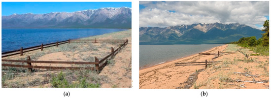 Lake Baikal has been functioning as a water reservoir since the late 1950s, following the regulation of the Angara River [21,22]. The construction of the Irkutsk HPP dam resulted in a 0.8 m increase in the lake level [23]. This led to a number of negative consequences: changes in the hydrochemical and hydrobiological regime, the flooding of residential houses and infrastructure facilities, the activation of abrasion processes, impacts on flora and fauna, etc. These changes occurred mostly in the Republic of Buryatia, in the eastern part of the lake with predominantly gentle shores [24].