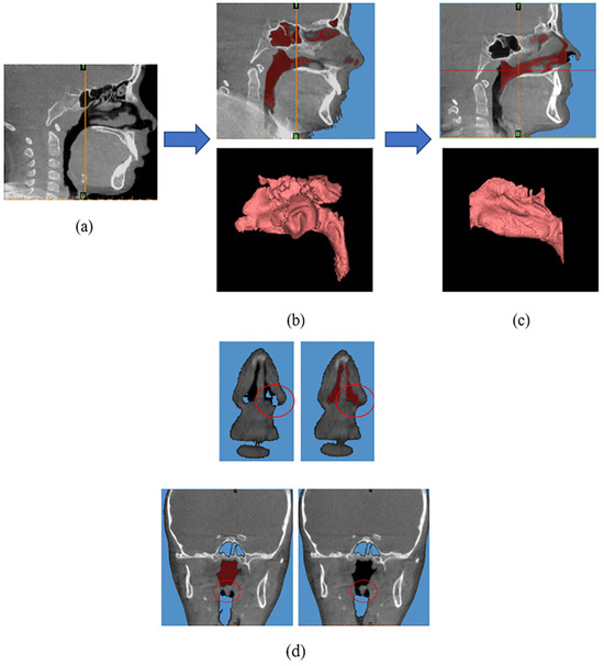 The method utilized in this research project is similar to the previously published protocol [18]. In summary, to create 3D nasal airway models from the CBCT scan images, the scans were imported into Materialise Mimics (Materialise®, Leuven, Belgium) (Figure 1a). A color mask was created by thresholding (Min: −1024 Hounsfield unit (HU), Max: −600 HU) in Mimics® (Figure 1b). Then, manual segmentation was used to remove unnecessary features slice by slice, such as the frontal sinus, maxillary sinus, pharynx, etc., to isolate the nasal airway model (Figure 1c). Additionally, to standardize the study methods, we removed the indeterminate apical parts of the nasal airway, which could be part of both the sinus and the nasal airway. The starting point of the anterior nasal airway boundary was defined as the most anterior slice where the boundary was closed (Figure 1d—upper ones). As shown in (Figure 1d—lower ones), the posterior boundary of the nasal airway was identified as the most posterior slice where the two parts are connected. The upper part belongs to the nasopharynx region, while the lower part belongs to the laryngopharynx region. Finally, the 3D nasal airway model was exported as an STL file.
