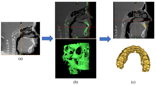 (a) Importing CBCT scan images into Mimics®. (b) Creating a color mask. (c) The maxillary teeth model.