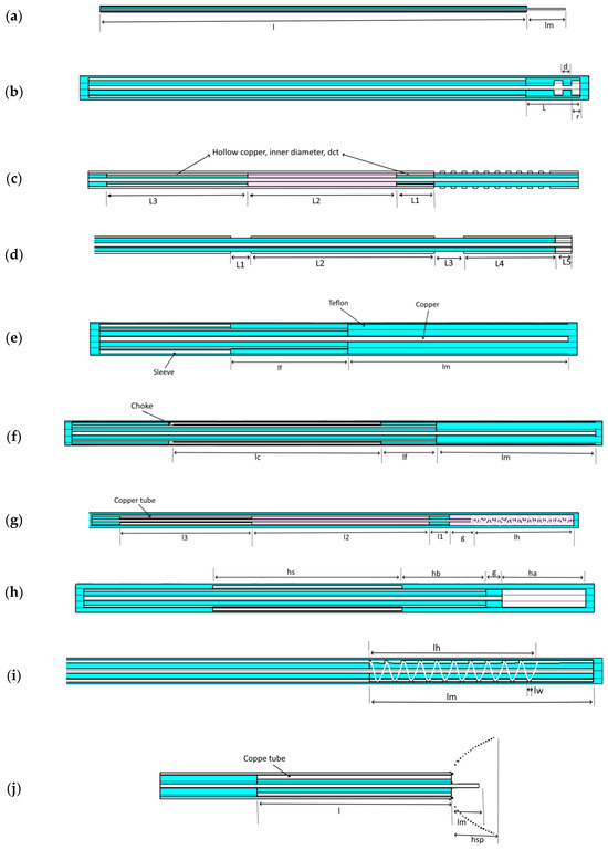 Topology of all designs considered in this work. The above figures represent: Monopole [43] (a), Capacitive capped monopole antenna [44] (b), Multi-slot antenna [21] (c), Dual-slot antenna [45] (d), Triaxial antenna [47] (e), Choke antenna [47] (f), Balun-free base-fed monopole antenna [47] (g), Floating sleeve dipole (FSD) antenna [46] (h), Balun-free helical dipole antenna [48] (i), and Helical open waveguide structure [41] (j). The light blue, purple, and white colors indicate Teflon, air, and copper, respectively.