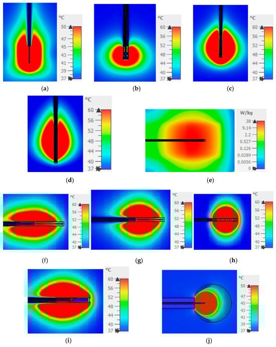 SAR of dual-slot and temperature distribution (ablation zone) of all the other designs and comparison with the figures (experiments or simulations) in their corresponding references. (a) Monopole → Figure 6 in [43]; (b) Capacitive capped monopole → Figure 4 in [44]; (c) Multi-slot → Figures 2 and 7 in [21]; (d) Balun-free helical dipole → Figures 5 and 7 in [48]; (e) Dual-slot → Figure 12 in [45]; (f) Triaxial → Figures 4 and 5 in [47]; (g) Choke → Figures 4 and 5 in [47]; (h) Balun-free base-fed monopole → Figures 4 and 5 in [47]; (i) FSD → Figures 4 and 9 in [46]; (j) Helical open waveguide → Figure 7 in [41].