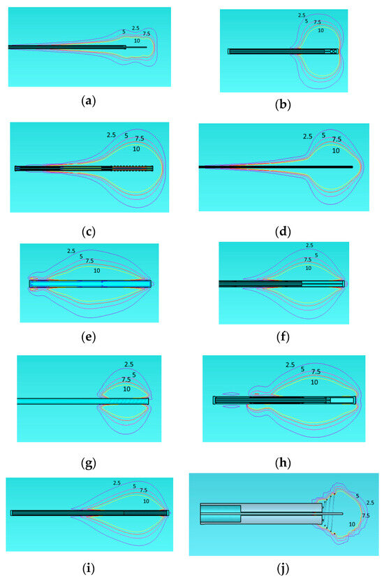 Specific Absorption Rate (SAR) of the different applicators embedded in a homogeneous tissue with εr = 46.8, σ = 0.861 at 915 MHz. Monopole antenna (a), capacitive capped monopole antenna (b), multi-slot coaxial antenna (c), dual-slot antenna (d), triaxial antenna (e), choke dipole antenna (f), balun-free base-fed monopole (g), floating sleeve dipole antenna (FSD) (h), balun-free helical dipole antenna (i), helical open waveguide structure (j) at one model (healthy tissue). The blue, purple, red, and yellow colors indicate SAR contours of 2.5, 5, 7.5, and 10 W/kg, respectively.