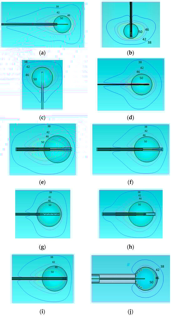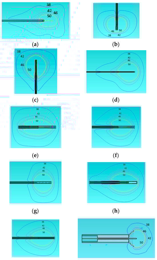 This part of the results addresses the temperature distribution across all designs within a two-compartment model. The corresponding results are displayed in Figure 8. It is again clear that only the two applicators Figure 8g,j show the temperature contours above 42 °C restricted inside or slightly outside the tumor boundary. Since it is desired to cauterize a ring of about 1 cm beyond the tumor boundary, Figure 8g is obtained for the appropriate deposited power of 40 W. However, the applicator of Figure 8j allows for an additional small increase of the source power.