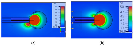 In this part of the paper, simulation results for Specific Absorption Rate (SAR) and temperature distribution are presented for all designs within a homogeneous model corresponding to a mean biological tissue with εr = 46.8 and σ = 0.861 at 915 MHz [52]. The simulations were conducted with consistent power deposition and the same insertion depth across all designs. Explicit comparisons follow in the two next subsections.