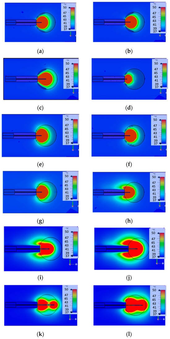 Figure 9 illustrates, through schematic representations, the results presented in Table 5. It is observed that the 50 °C isothermal line encloses the 3 cm or 2 cm tumor diameter in all cases. However, only the open waveguide (Figure 9j) restricts the 38 °C isothermal to only 1 cm beyond the tumor boundary as desired to avoid healthy tissue damage.