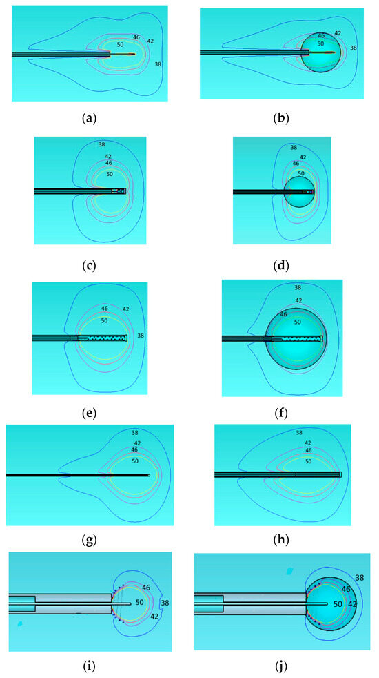 The applicators in Figure 2a,c,d,f,g,i retain the comet-tail shape of ablation area, which causes difficulties in ensuring the safe exposure of healthy tissues on the back side of the applicators. On the contrary, the treated area is closer to a spherical shape in Figure 2b,h. However, it is only in Figure 2j that the ablation area is restricted inside the tapered spiral providing the means to control the exposure of the healthy tissue.