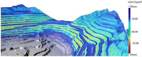 The software platform supports map import functionality, allowing the import of three-dimensional topographic maps of opencast mine slopes captured by drone aerial photography into the radar monitoring platform for three-dimensional registration, as shown in Figure 2. Additionally, observation points can be manually set on the topographic map, and the system will automatically calculate displacement change data, velocity change data, acceleration change data, and reciprocal velocity change data for each observation point. Compared to GNSS monitoring technology, ArcSAR radar monitoring technology offers advantages such as non-contact, high sampling rate, high precision, and overall regional monitoring. While ArcSAR radar monitoring technology offers numerous advantages, it is important to note its limitations, particularly in terms of the high cost, data processing complexity, and high maintenance difficulty involved in using the equipment.
