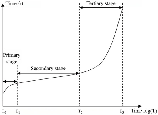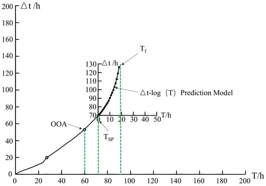 Based on the three-stage theory of slope creep and sliding, the displacement–time curve exhibits a stage of uniform deformation prior to the accelerated deformation stage. During this stage, the deformation rate of the slope remains basically constant, and the average velocity of the landslide can be assumed as . By applying the physical relationship of displacement, which is obtained by multiplying velocity by the relative time of motion, Equation transforms into a logarithmic function relationship of time (), as shown in Equation (4); we can derive a logarithmic function relationship between (relative time) and (absolute time). This transformation serves to unify the dimensional units of the horizontal and vertical axes of the analysis curve. The purpose of unifying the dimensional units of the coordinates on the analysis curve is to address the issue of convergence in the curve fitting of monitoring data, ensuring that the constants and , and the value can be accurately calculated through curve fitting, as shown in Figure 3.
