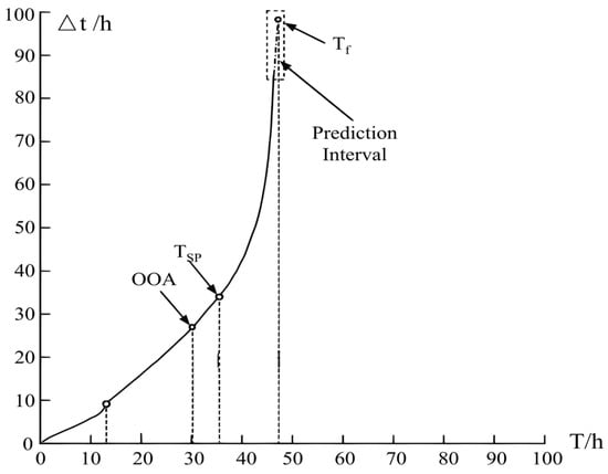 Considering that using OOA as the starting point for calculations may result in lower prediction time accuracy, this study proposes using a normally distributed confidence interval to dynamically identify the for the slope deformation acceleration. The point is selected based on whether the velocity variable no longer falls within the confidence interval (), where μ represents the mean and is calculated using Formula (6), as shown below.