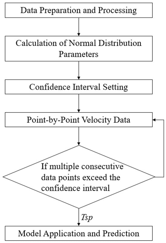 During the second stage of uniform deformation in slope landslides, the measurement errors of the monitoring data follow a normal distribution. However, the measurement errors of the monitoring data during the acceleration stage do not follow a normal distribution [30,31]. Therefore, the normal distribution confidence interval can be considered for dynamically identifying the Time of Start Point () for the slope deformation acceleration. When the deformation velocity falls outside the confidence interval of the normal distribution, it indicates that the deformation velocity begins to increase significantly. The monitoring data point determined at this time is taken as the .