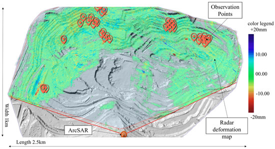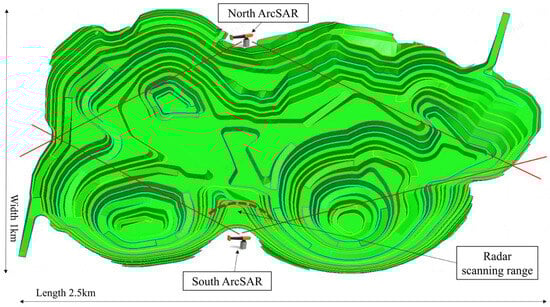 Considering the geological conditions and mining processes at the site, there are varying levels of landslide risk around the perimeter of the open-pit mine area. Therefore, a comprehensive slope monitoring scheme using two slope radars has been designed to cover the entire mine area, as shown in Figure 8. The slope radars selected are ArcSAR (Software version number: SSR200K V2.1. The manufacturer of this device is Changsha Smart Mining Inc., Ltd., which is from Changsha, China. This device has been purchased by the mine.) radars, which are deployed at high points in the north and south directions of the mine area. Initially, the radar equipment can be installed in a fixed position. However, as the slope height increases, there may be blind spots in the radar’s field of view. To address this issue, the radars can be deployed at the bottom of the open pit to provide real-time monitoring of high and steep slope areas that pose a risk.