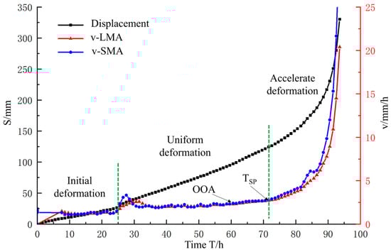 The displacement, v-SMA, and v-LMA data are plotted into a curve graph, as shown in Figure 10. According to the method proposed by Carlà, T. et al. [23], the starting point of the acceleration phase, OOA, corresponds to a relative time T = 60.6 h on the horizontal axis. By comparing the displacement curves, it was found that at the OOA point, the displacement curve had not yet undergone significant nonlinear or accelerated changes.