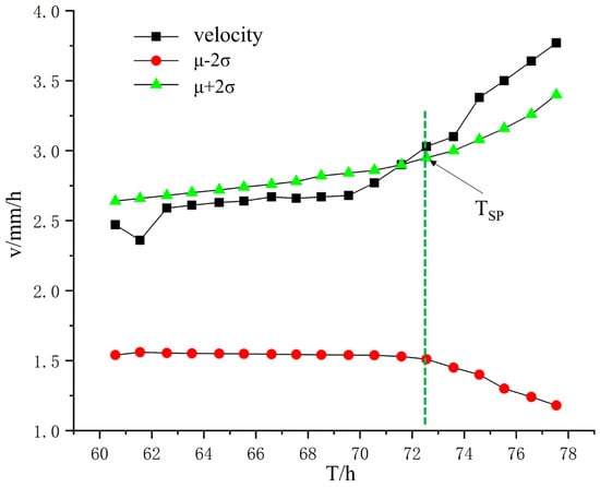 Using Table 1 and Formula (6), the curve shown in Figure 11 can be calculated. After the OAA point, the velocity curve monitored by the radar is still within the confidence interval. However, at = 72.55 h, the velocity curve no longer falls within the velocity confidence interval (), and this point is identified as the point. The point marks the critical transition from the second stage of creep deformation (constant velocity deformation stage) to the third stage (acceleration deformation stage).