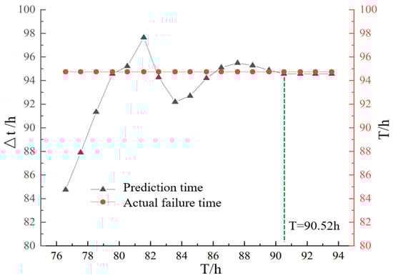 The statistical curve of the predicted landslide time from Table 2 and the actual landslide time is shown in Figure 14. Initially, due to the limited number of data points, there was a large error between the predicted time and the actual landslide time. As the monitoring data continued to be updated, at T = 90.52 h, the predicted time curve remained basically unchanged and was almost level with the actual landslide time curve. This means that the actual landslide time can be accurately predicted 4 h in advance, and there is no lag in the prediction time.
