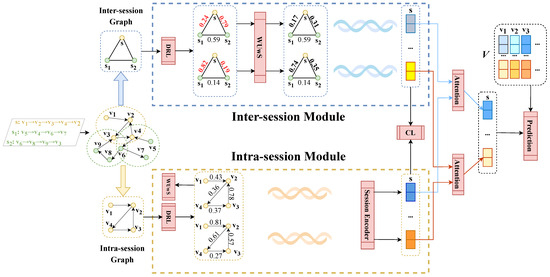 We define an intra-session graph to be a directed graph for representing the inner relations in a session s as in SR-GNN [12], where the superscript l stands for local. The vertex set is items appeared in s. The edge set , where is the i-th item in session s. That means that each edge in starts from the previous item and points to the next item in the sequence of session s. Take in the lower-left portion of Figure 1 as an example. The vertex set . The edge set .