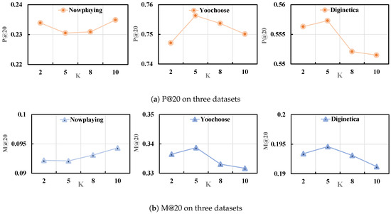 In the experimental settings, the number of factors is the most significant hyperparameter of the DEISI model, which is used to fine-tune the degree of refinement of the intra and inter-session dependencies. A smaller value of may hinder the complete separation of dependencies, while a larger value of may lead to excessive refinement of the dependency. Furthermore, increasing may result in a small factor-level embedding dimension, which may not fully represent the semantics of the factor-level. For datasets exhibiting higher complexity, exemplified by but not limited to those with dense interaction patterns, a larger value of k is essential to enable the model to capture intricate inter-sessional dependencies. Conversely, for simpler datasets, a smaller k value suffices. To investigate the impact of different values on the performance of DEISI, we set to 2, 5, 8, and 10, respectively, and evaluate the corresponding model performance on the three datasets, as shown in Figure 3a,b. Ultimately, for the Diginetica and Yoochoose1/64 datasets, and for the Nowplaying dataset.