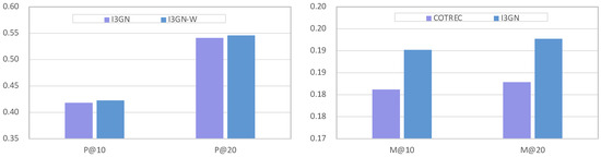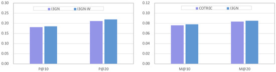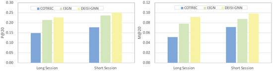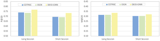 We studied the relation between the performance and session lengths and tried to explore whether DEISI’s factor-level inter-session dependency learning can somewhat solve the problems. Here, we performed experiments on the Yoochoose1/64 dataset and Nowplaying dataset. We first split the test sets into long sessions and short sessions. Similar to [12,33], sessions with a length ≥ 5 are defined to be long sessions, while the others are short ones. After that, we obtain two sets of long and short sessions and test the performance of DEISI and two state-of-the-art baselines, I3GN and COTREC. After that, we compare their performances on two datasets shown as Figure 4 and Figure 5. The experimental results show that DEISI is superior to the other two models in both long and short sessions. This shows that our model comprehensively improves the accuracy of recommendation.