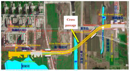 The cross passage is located under Jingwang Road, where there is no structure on the ground. The center mileage of the left and right line shield tunnel at the cross passage is LDK27 + 149.198 (RDK27 + 154.500), the center distance of the tunnel at the cross passage is 13.0 m, and the elevation of track surface of the left and right line tunnel is −19.131 m and −19.129 m, respectively. The ground elevation is about +2.60 m.
