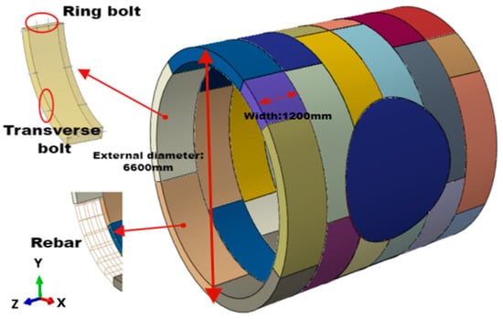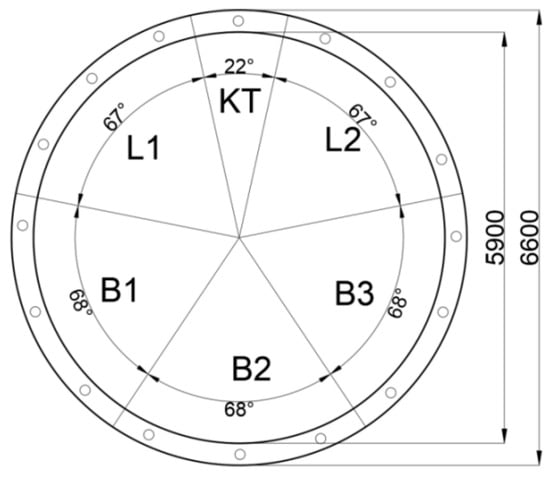 Figure 5. Each ring segment is divided into six blocks along the ring direction, namely three standard blocks (B1, B2, B3), two adjacent blocks (L1, L2), and one capping block (KT). The outer diameter of the segment is 6.6 m, the width of the segment is 1.2 m, and the thickness is 0.35 m. The reinforced concrete segment is with strength grade of C50, and part of the segment is made of steel-mixed special segment. The steel reinforcement has a strength grade of HPB300 and HRB400.