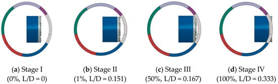 Figure 9, four analysis stages are set up: stage I, stage II, and stage III and stage IV. And the cutting process in percentage and the ratios of the cutter displacement to the tunnel diameter (L/D) also represent the states.