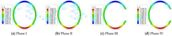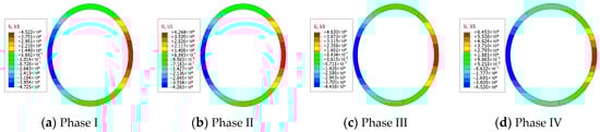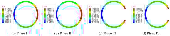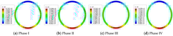 Figure 12, the maximum displacement in the horizontal direction occurs in stage I, the maximum displacement in the vertical direction occurs in stage IV, the maximum displacement values are 5.812 mm, 6.223 mm, respectively. In stage I, the segment is subjected to soil and water pressure, and the maximum displacement appears in the vertical direction. In stage II, the internal support system begins to function, and the displacement of the segments under the support of the bracing boots is reduced. With the continuous driving of the cutter head, the cutter head gradually grinds the concrete of the tunnel door, and the displacement of the segment in the horizontal direction increases due to the jack-up action of the cutter head to the tunnel door and the reaction force of the reaction frame. After the tunnel is constructed, the top and bottom of the tunnel are squeezed by water and soil pressure, and the displacement increases further.