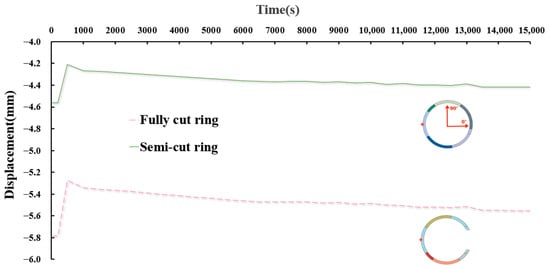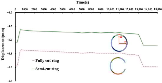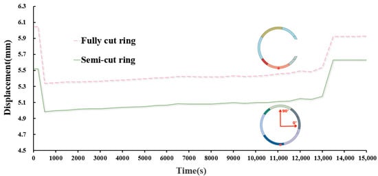 Figure 16, at 90° angle, the displacement of the fully cut ring is greater than the displacement of the semi-cut ring. A pre-support system greatly decreases the displacement of the top of the tube ring. After the cutting begins, the top shift in the two rings gradually increases with the cutting. It is worth noting that the top of both rings produced a significant displacement downward when the cave opening was to be opened. After the hole was opened, the displacement stabilized.