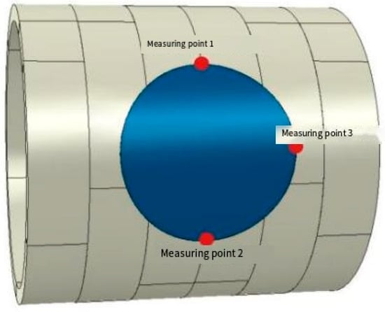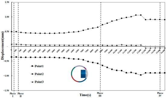 According to the results of the processed cloud image, the segment displacements of the fully cut ring and the semi-cut ring in the four construction stages are analyzed above. To further analyze the regularity of segment displacement, after the main tunnel is holed, measuring point 1, 2, and 3 as shown in