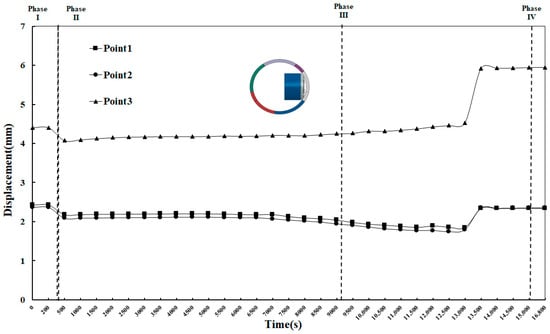 Figure 20), in the first stage, soil and water pressure moved measuring points 1 and 2 to the inside of the tunnel. After the second stage, with the cutter head starting to cut the tunnel portal, the displacement trend of measuring point 1 and 2 are significant, and the displacement gradually increased. From the third stage when the upper and lower parts of the tunnel door have just been worn through to about 15,000 s, the displacement of the first and second measuring points are increasing. When the concrete in the waist of the tunnel door was about to be destroyed, the pushing force of the shield machine is small, and the displacement of each measuring point in the vertical direction is also reduced. After the hole is formed, the displacement of the points tends to be stable.