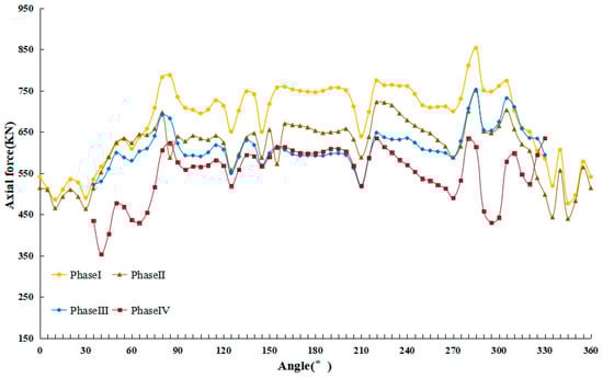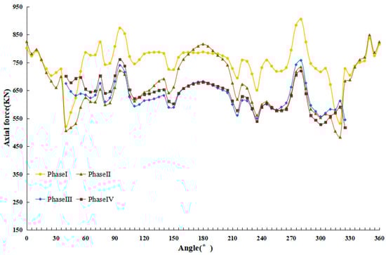 Figure 26 that the axial force at the top and bottom of the fully cut ring is larger than that at the waist of the fully cut ring, andsmaller before the cross passage is excavated. During the second stage, upon the application of the pre-support, the axial force of the cutting ring is changed, and the structural force is thereby enhanced. At the same time, the phenomenon emerges that the axial force at the waist becomes larger and that at the top and bottom turns out to be smaller because of the pre-support system. In the third stage, the cutterhead penetrates the upper and lower parts of the portal, which changes the stress state of the whole cutting ring again to a certain extent, resulting in a situation where the axial forces at the top and bottom of the ring are large and the axial force at the waist is small. In the fourth stage, with the completion of grinding the concrete at the portal, the bearing capacity of the portal weakens, and the fully cut ring is obviously affected by the vertical water and soil pressure, leading to changes in the level of the axial force. However, the change in the axial force at the waist is rather insignificant.