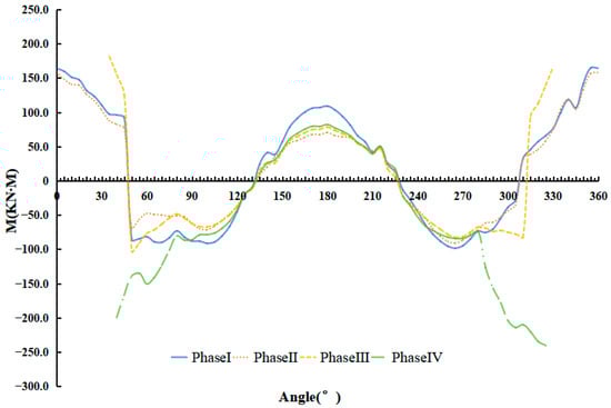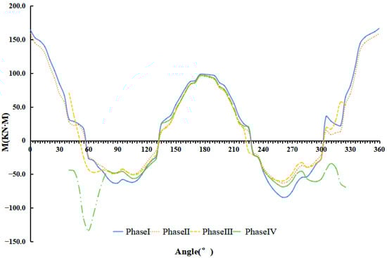 The fully cut and semi-cut ring in the main tunnel were selected for bending moment analysis. Around the fully cut ring, every 5° was taken as a section, while the resultant bending moment of the section was calculated. The bending moment diagram of the fully cut and semi-cut ring at four different stages is obtained as shown in